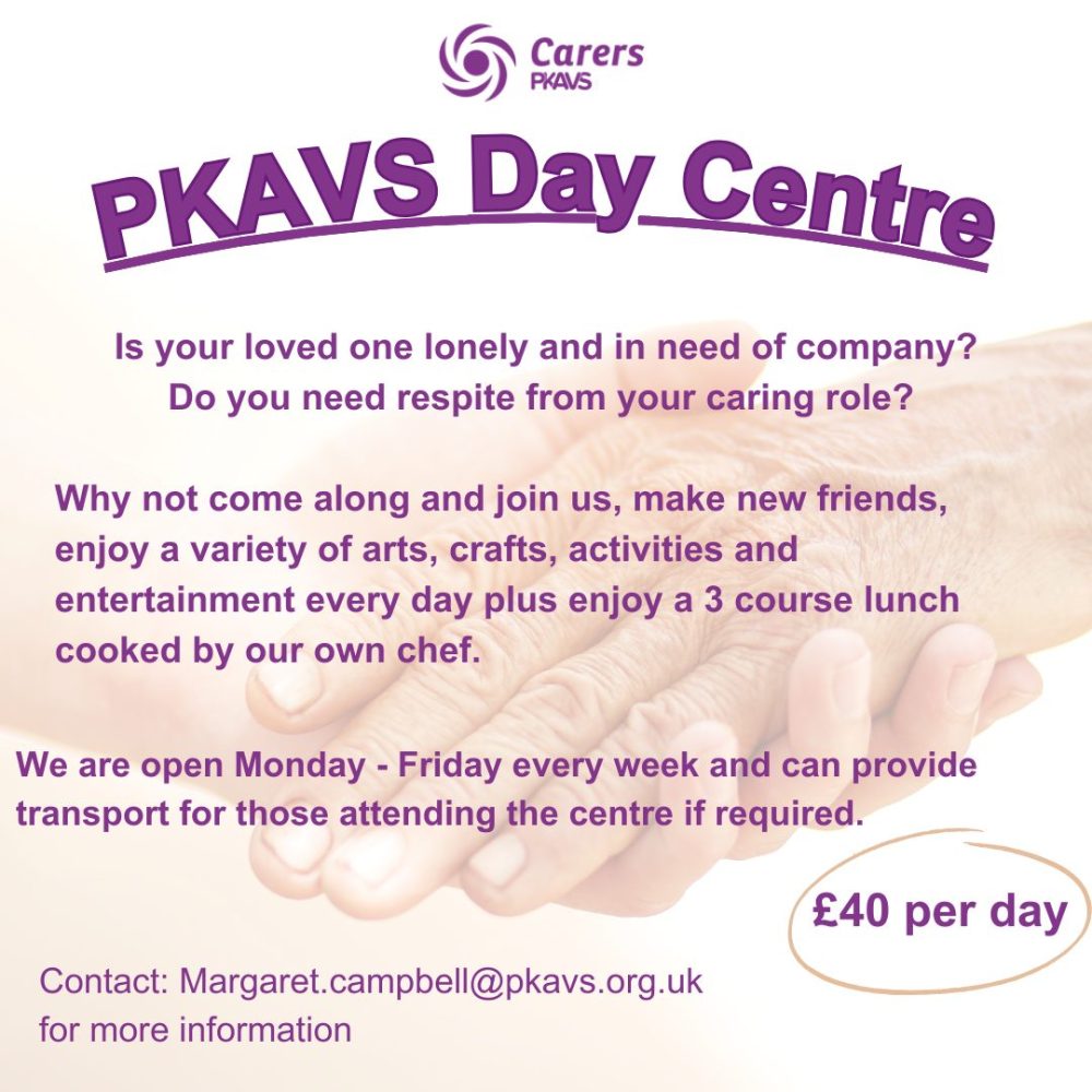 All for just £40 a day!! Contact Margaret at the Day Centre for more information on 01738 567076 or email margaret.campbell@pkavs.org.uk.